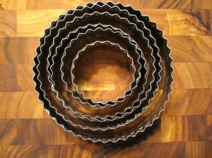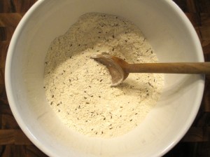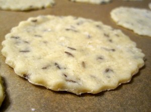 ****Cookie cutter: I chose and liked a 2.5″ biscuit cutter with fluted edge, but most shapes would work, as would the top of a drinking glass. As mentioned, the dough does shrink a bit on the cookie sheet and then in the oven – none of my circles baked up to be perfectly even, and the caraway seeds make for somewhat ragged edges, so avoid any intricate shapes.