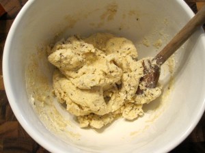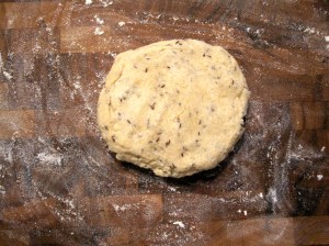In a mixing bowl, stir together the dry ingredients. Stir in the vanilla and the cream about 1/2 c. at a time, incorporating it thoroughly before adding the next pour. (A wooden spoon works nicely here.) The dough should start to hold together in a shaggy mass damp enough to be squeezed gently into an elastic, cohesive ball. (It shouldn’t be so damp that it sticks to your fingers at all – this isn’t a particularly messy dough. If this does happen, just add a touch more flour.) ]