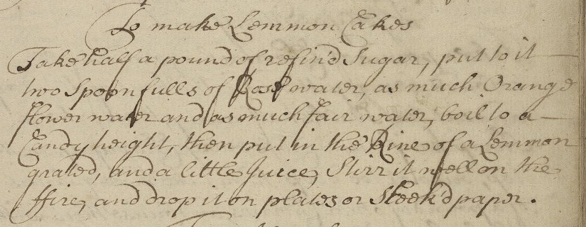 Not all recipes are original. Flipping through MS Codex 785 I was intrigued by this recipe for “Lemmon Cakes.” These lemony sweets are candies, not cakes! But with a little research into the recipe’s ingredients and methods (fair water? candy height? sleek’d paper?) I located its origin: This recipe is a verbatim transcription from Hannah Woolley’s cookery book The Queen-like Closet or Rich Cabinet: Stored with all manner of Rare Receipts For Preserving, Candying and Cookery. Very Pleasant and Beneficial to all Ingenious Persons of the Female Sex (1670).