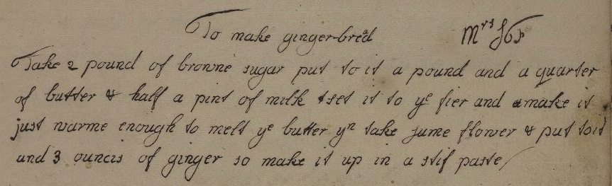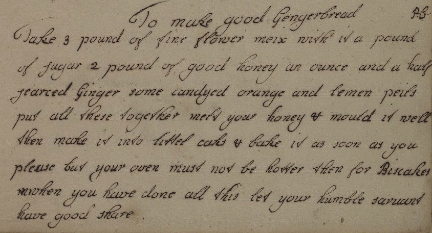 Gingerbread as a dessert began appearing in Europe around the fifteenth century, originally as a mixture of breadcrumbs held together with honey and ginger, then shaped using molds. At Queen Elizabeth I’s court, gingerbread was baked into the shape of people and decorated to look like visiting foreign dignitaries – the first gingerbread men! In the late seventeenth century, ginger would have been imported into England (most likely from Jamaica, the Spice Islands, or India) as the whole root, sometimes pickled. That Cotton’s book includes not one but three recipes for gingerbread indicates ginger’s availability and the treat’s popularity by 1698.