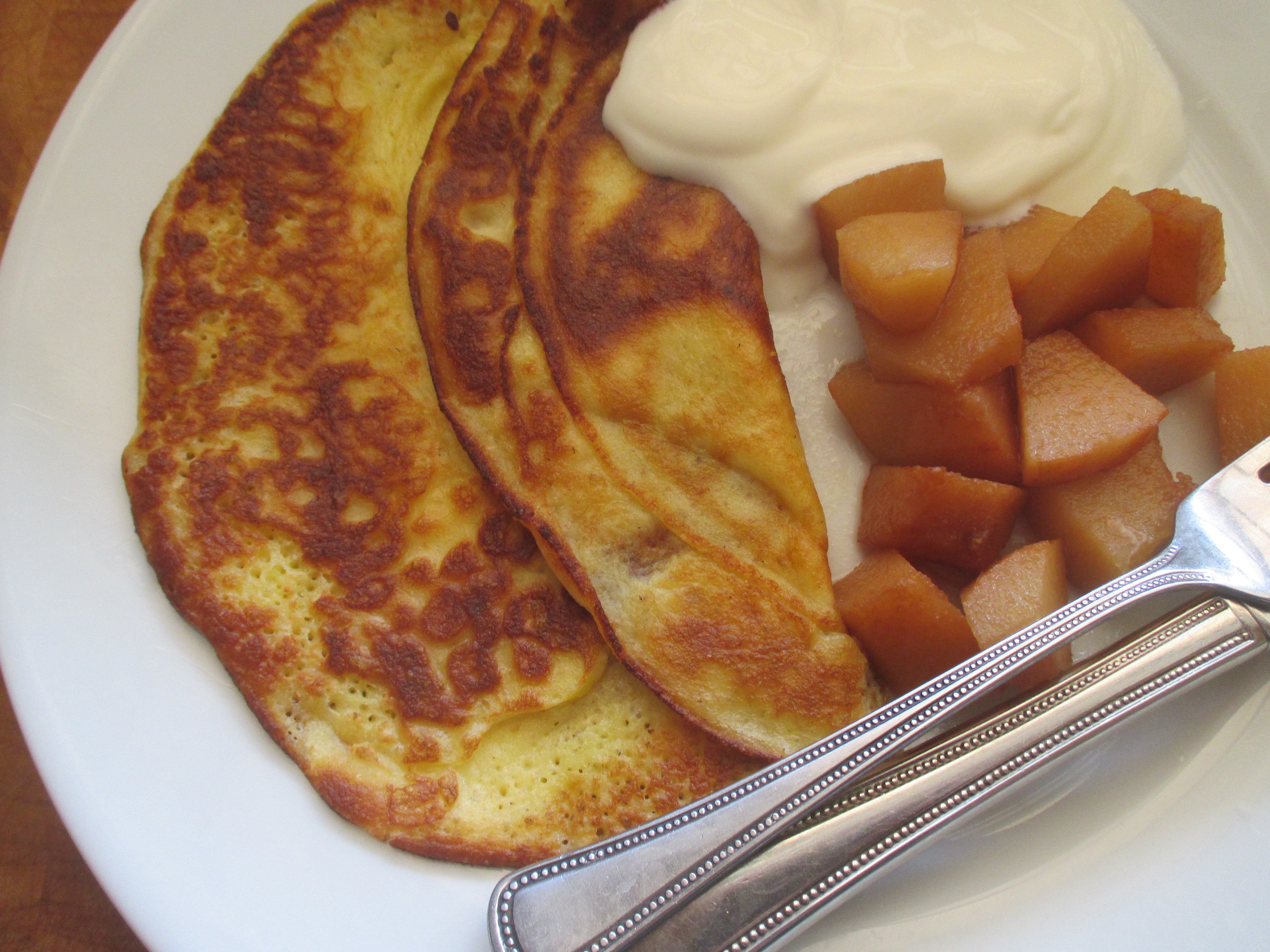 Unfortunately, the syrup did not become jelly. I think this is partly because the original recipe instructs cooks to discard the pectin rich quince cooking water. On the other hand, perhaps my apple water could have been prepared more effectively. Luckily, the non-jellied liquid made an awesome syrup for the pancakes. Let us know if your quinces jelly!