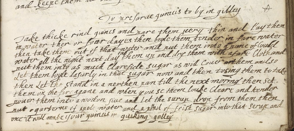 This recipe from UPenn MS Codex 252 instructs cooks in a complex method for preserving quinces in a gelatinous liquid thickened with sugar and pectin from apples and the quinces themselves. Our recipe, below, is a bit simpler.