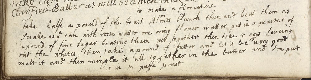 Alyssa and I have seen many recipes for “florentine” in manuscript cookbooks. This specific recipe is a sweet almond filling baked in a pastry crust. There are, however, other “florentines” out there. The Oxford English Dictionary defines a florentine as “A kind of pie or tart; esp. meat baked in a dish with a cover of paste” and notes the range of spinach dishes called “florentine” from the mid-eighteenth century to the present day. (The OED cites a Hannah Glasse recipe which looks like the 252 recipe with added spinach and cheese. )