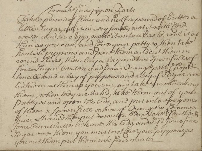 Today it feels like fall on the east coast. The Philadelphia weather on Wednesday reminded me of September heat-waves in California (when I made this lemonade), but today, apparently, fall is here. In September I braved the weekend heat to pick apples at Linvilla Orchard and, as usual, I bought lots. So I went through my “to make” list in search of apple recipes and saw this recipe for “fine pippen Tarts” from UPenn MS Codex 785. (I’ve cooked from this manuscript a lot: check out our new manuscript and library tags to see what archives we’ve been cooking.) It took me a little while to get into the kitchen to try this recipe (the heat, the big talk I gave, grading), but these pippin tarts are truly fine.
