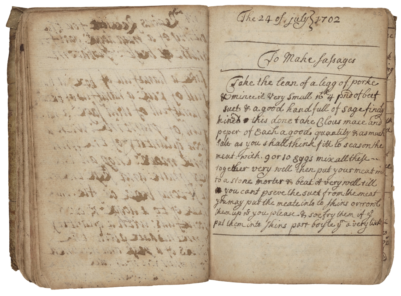 Of course, tasting recipes is always best, too. This time, I decided to try Baumfylde’s recipe for sassages (or sausages). I was intrigued that this recipe provided instructions for both cased and uncased sausages. It’s also one of the rare recipes that comes with a specific date: 24 July 1702. Baumfylde’s sassages are delightfully flavored with sage, mace, cloves, and black pepper.