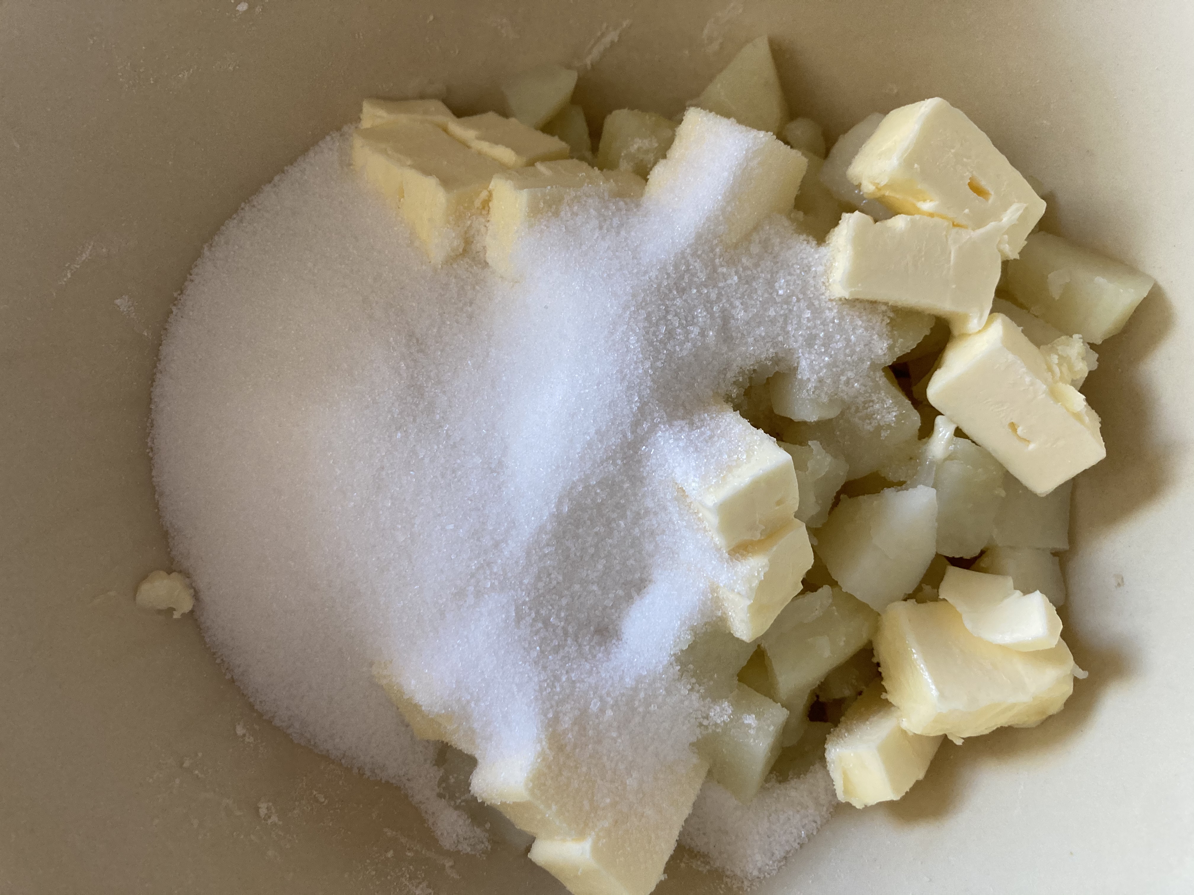 Peel the potatoes. Chop them into small cubes. Boil them until they are cooked and tender (about 15 minutes). Drain off the cooking water using a colander. Juice and zest the lemons. Put the cooked potatoes, sugar, and butter in a sturdy bowl. Mash the potatoes and integrate the butter and sugar into the mix. Make sure there are no lumps of butter or potato. Stir in the lemon juice and zest.