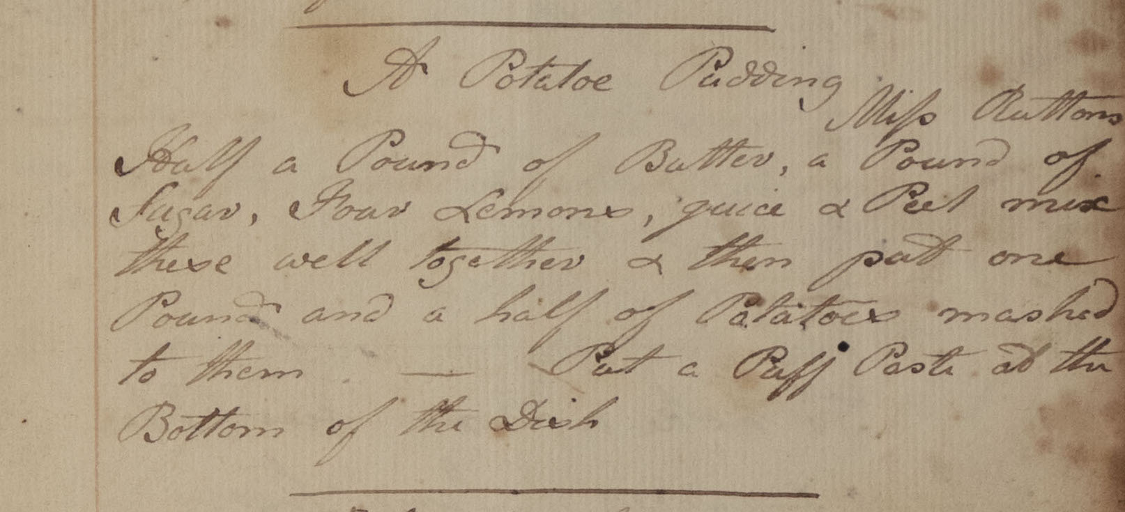 The Browne recipe book was compiled in the late eighteenth century and early nineteenth century. This recipe for a potato pudding speaks to a moment when European cooks were trying to make sense of where indigenous American ingredients – both sweet and white potatoes and particular cultivars thereof – fit into established cookery traditions. Was is best to include potatoes in sweet dishes or savory ones? How would their gorgeous sweetness and earthy flavors best compliment European ingredients?