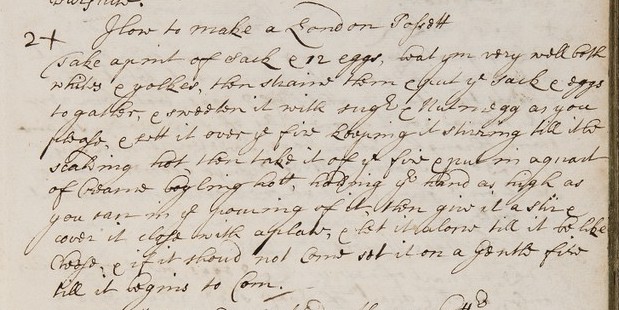 Hawar’s book has another, intriguing London reference: a recipe for “How to make a London Possett.” I’m not sure, exactly, why this posset recipe is specific to London, but it’s certainly another link between Hawar’s manuscript and the city where she lived, cooked, and ate. I didn’t have time to speak about the posset at the conference — there’s always a lot to say about ice cream! — but I wanted to share some thoughts about testing Hawar’s posset recipe here.