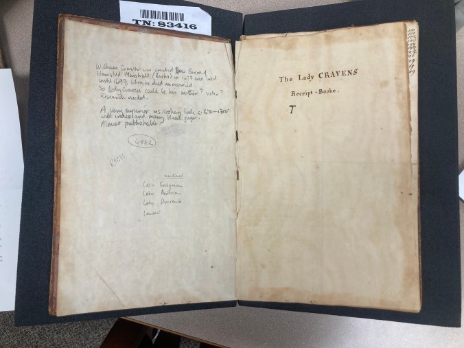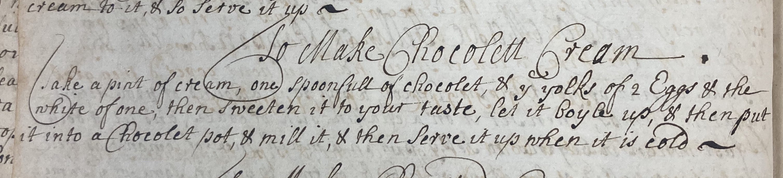 On a recent visit to State College, I was delighted to see a new addition to our recipe book collection. Lady Elizabeth Craven began to compile this recipe book in 1702 in the early years of her marriage and was still adding recipes to its pages at the time of her death in 1704, at age 25. There is much more to learn about Lady Craven and her manuscript and I was immediately interested in her fashionable recipe for “Chocolett Cream.”