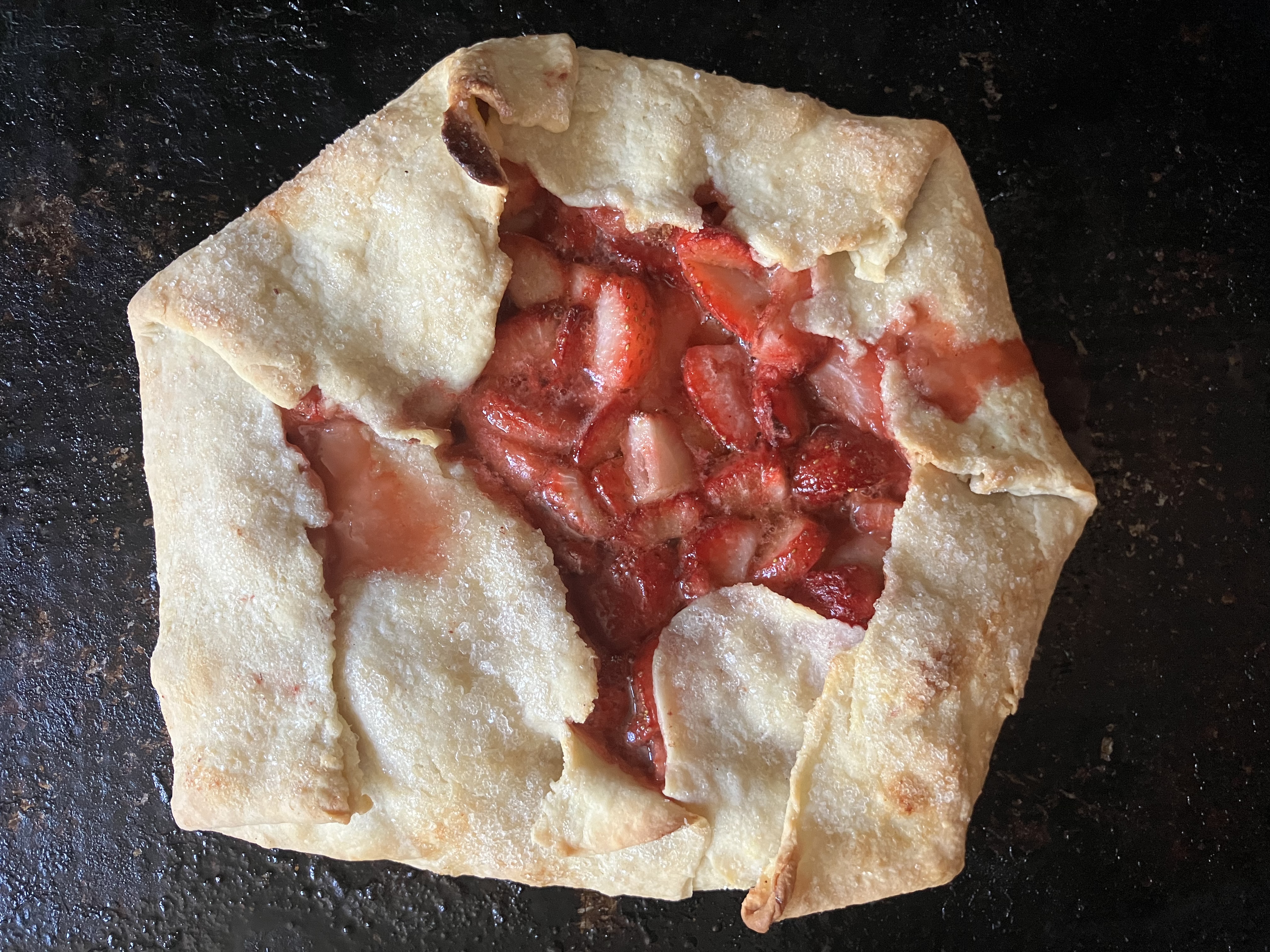 I made one tart pan full of 12 tarts. By the time these came out of the oven, my kitchen was getting incredibly hot and I quickly shaped the remaining pastry into a (delicious) rustic galette filled with the remaining seasoned strawberries. I believe I had enough of everything to make about 8 more lidded tarts. If you only want to make a dozen tarts, I believe half the seasoned strawberry fulling will suffice, but you will need more than half the dough and the recipe above is not easy to divide as it contains a whole egg.