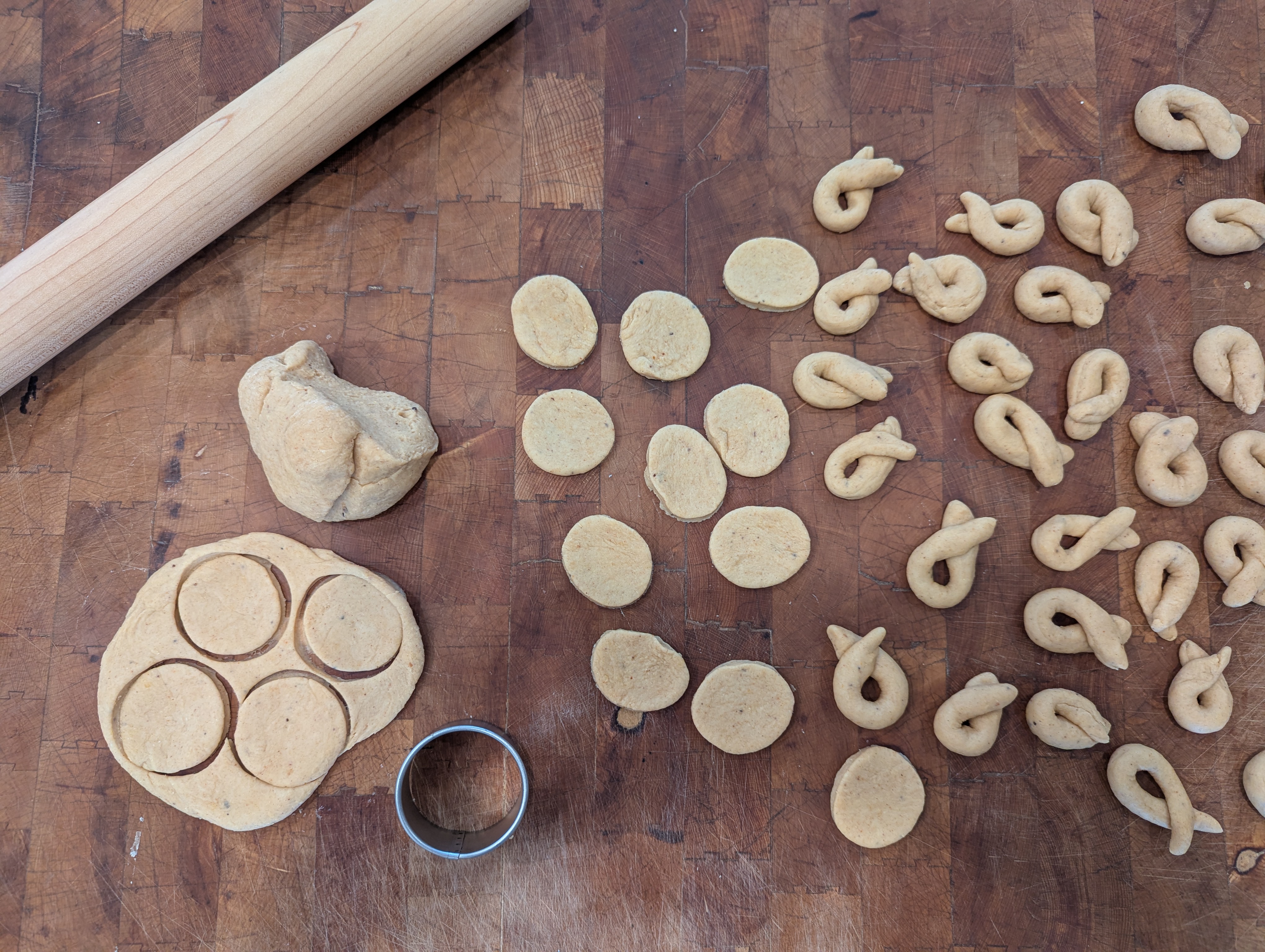 During the sixteenth and seventeenth centuries, cracknells were boiled prior to baking. This is the type of cracknell recipe included in Lady Anne Percy’s recipe book. These cracknells have an outer layer that cracks when you bite into it but depending on exactly when you are eating it and what type of baking and drying method you use, it might be dry and crisp on the interior, or slightly chewy. The cookie, however, should not be tough or heavy. These cracknells were usually spiced and slightly sweetened, and some recipes included ingredients like wine or yeast in the dough. A seventeenth-century recipe from a manuscript at the Folger Shakespeare library describes shaping cracknells by rolling dough “vpon a smooth table with your hands into little long roules, and make them into knotts as you doe iumballs, or what fashion you will.” This older cracknell form has much in common with Italian tarelli, another boiled-and-baked treat still available today.