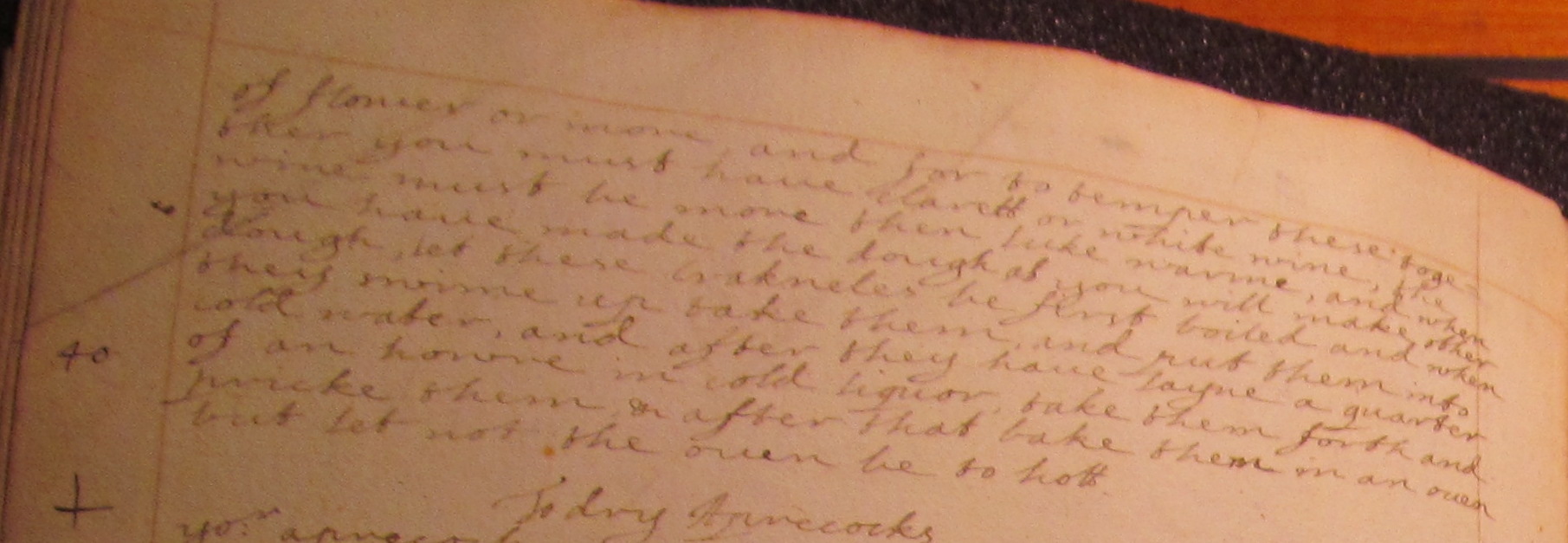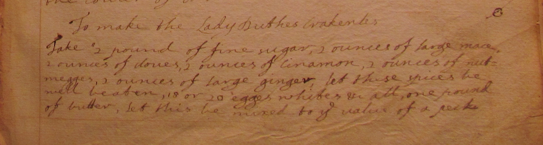 A teenaged Lady Anne Percy copied her mother’s recipes into her recipe book in a distinct hand with a mix of italic, roundhand, and secretary features around 1650. Philip Lord Stanhope, her husband, writes a note inside the front cover of this manuscript to tell us that it is her hand and that these are her family recipes. Remaining in her husband’s family’s library for generations, the undigitized manuscript, Whitney MS 2, is now part of the Whitney Cookery Collection in the New York Public Library’s Manuscripts and Archives Division. It contains a variety of culinary, confectionary, medical, and household recipes. This recipe is one of three cracknell recipes in the manuscript.