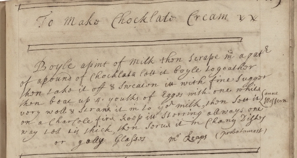 This recipe “To Make Jumballs of Chocholett” is from Elisabeth Hawar’s recipe book (now William Andrews Clark Memorial Library, fMS.1975.003). A favorite on the banqueting table or dessert spread, many recipes for “Jumballs” or jumbles are collected in early modern recipe books. These small cookies are made from flour and almonds in varying proportions, sweetened with sugar, and flavored with anise, caraway, and, in this recipe, lemon, rosewater, and chocolate.