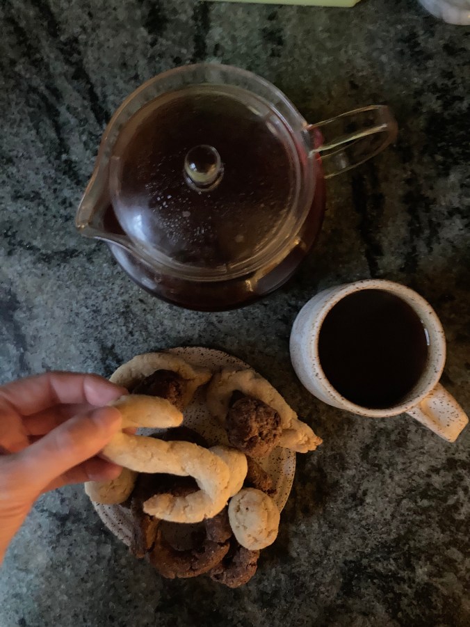 The original recipe for Hawar’s chocolate jumballs is a complex, two-part affair. The first part provides instructions for blanching and grinding almonds in a mortar and a pestle to make an almond paste . Lemon peel and juice, rosewater, sugar, and “gum dragon” — dried, water-soluble plant sap used as a binder — help the freshly cooked and pulverized almonds form a paste. The second part of the recipe provides instructions for shaping jumballs out of this mixture with the addition of an egg white and flour. The pliable dough can be formed into pleasing shapes and gently, carefully baked as the oven cools from an intense period of bread baking.