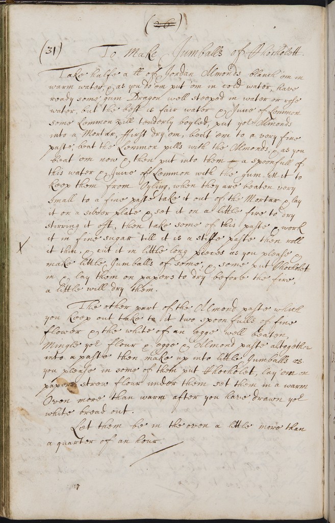 This recipe “To Make Jumballs of Chocholett” is from Elisabeth Hawar’s recipe book (now William Andrews Clark Memorial Library, fMS.1975.003). A favorite on the banqueting table or dessert spread, many recipes for “Jumballs” or jumbles are collected in early modern recipe books. These small cookies are made from flour and almonds in varying proportions, sweetened with sugar, and flavored with anise, caraway, and, in this recipe, lemon, rosewater, and chocolate.