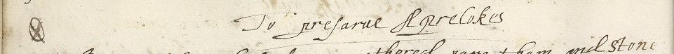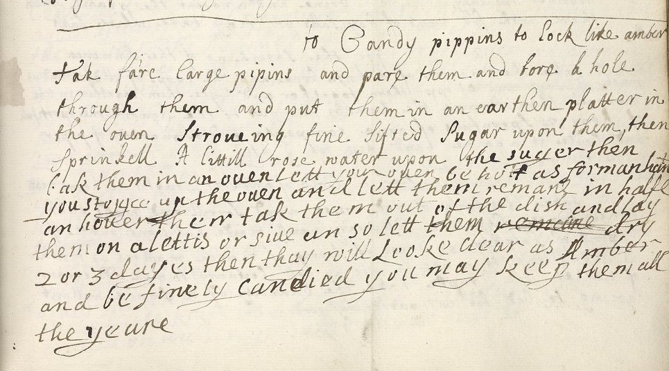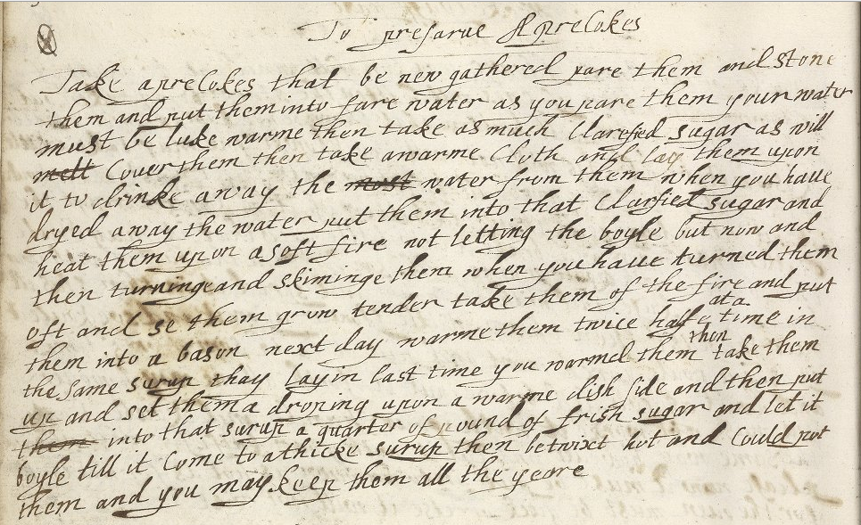 This circle and X marking next to the recipe title indicates that someone cooking from this book prepared preserved apricots and the recipe, most likely, worked. I first learned about these circles, checks, ticks, fleurons, and other marks in recipe books when I heard Wendy Wall deliver a lecture about Shakespeare and early modern women’s medicinal knowledge. (I’m excited to read her new book, Recipes for Thought, when it comes out this fall. ) Wall and other historians of food and medicine consider markings like these part of the progression of scientific knowledge in the kitchen. They are the handwritten remains from many otherwise undocumented experiments. Cooks tried recipes and made (a few) notes about how they turned out. In this same manuscript the recipe for Could Possett was also marked and we loved how that refreshing drink turned out!
