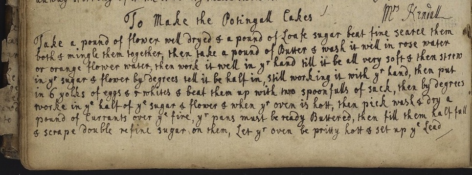 This recipe comes from the first volume of UPenn Ms. Codex 631, dated 1730. (This two-volume collection has become one of our favorites.) “Potingall” is probably a stand-in for “Portugal,” since the recipe closely resembles the fairly common recipe for “Portugal cakes” found in many seventeenth- through nineteenth-century cookbooks. Getting “Potingall” from “Portugal” doesn’t seem unreasonable: the two words are visually similar, and the writer copying the recipe into Ms. Codex 631 could have been working from another recipe that was difficult to read or itself mistaken. (Like an eighteenth-century game of telephone!) “Portugal” named a type of orange in the period and might refer to the recipe’s use of orange flower water. However, Portugal cakes’ name more probably relates to one of their ingredients: sack, a sweet, fortified white wine originally produced in Portugal.