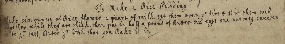 Carrot pudding still comes out the winner for me in our Great (and ongoing) Pudding Experiment, but potato pudding was interesting. While the carrot pudding recipe includes a specified amount of sugar and candied peel AND instructs the cook to sweeten it to taste, this one simple directs the cook to sweeten it to taste. The white wine and nutmeg produce a flavor profile not quite sweet or savory (especially given that the recipe doesn’t call for any salt), so how much sugar you add can alter the taste considerably. It tastes recognizably of potatoes – in fact, I’d perhaps try this with sweet potatoes, since I really like their natural flavor – and bakes up quite firm, more so than the carrot pudding. I’d had enough after a few bites. The potato plus some tang from the wine plus the earthiness of the nutmeg didn’t quite add up to something I’d be eager to try again. But it’s very easy to make and requires few ingredients, making it a simple dish to prepare. This ease might explain the prevalence of all varieties of pudding in early modern cooking – they’re easy, usually inexpensive, and can be scaled to large quantities. Stay tuned for the rice pudding report!
