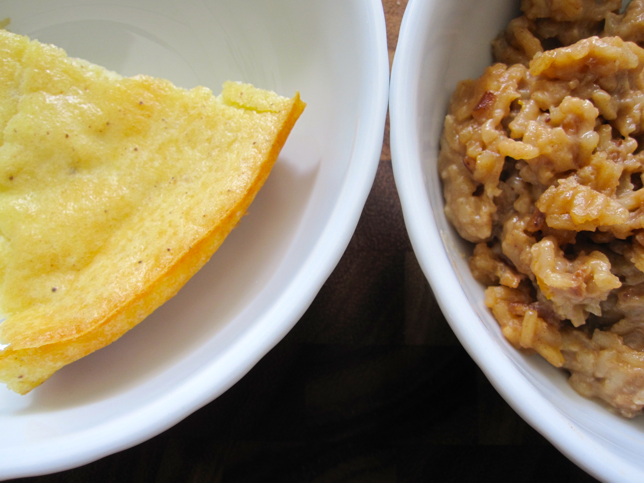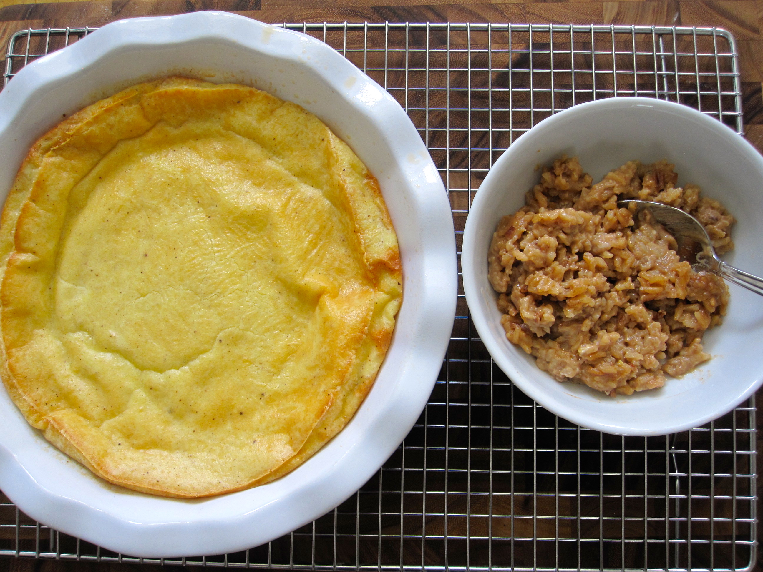 Very orange. And surprisingly pleasant: the apples, citrus, and spices balanced the vegetal base of the carrot. The consistency was somewhere between a pumpkin pie filling and a flan: firm enough to hold its shape when sliced, but jiggly enough that a few dollops ended up on the floor between pie dish and plate. (Oops.) We might bake it in a pie crust next time, or add another apple to the mixture, or perhaps roast the carrots and apples before pureeing them for additional depth of flavor. Adding some pureed carrots to a pumpkin pie base might also work well.