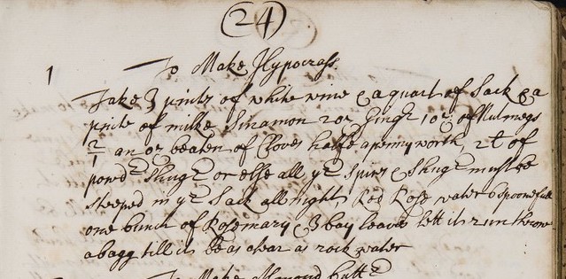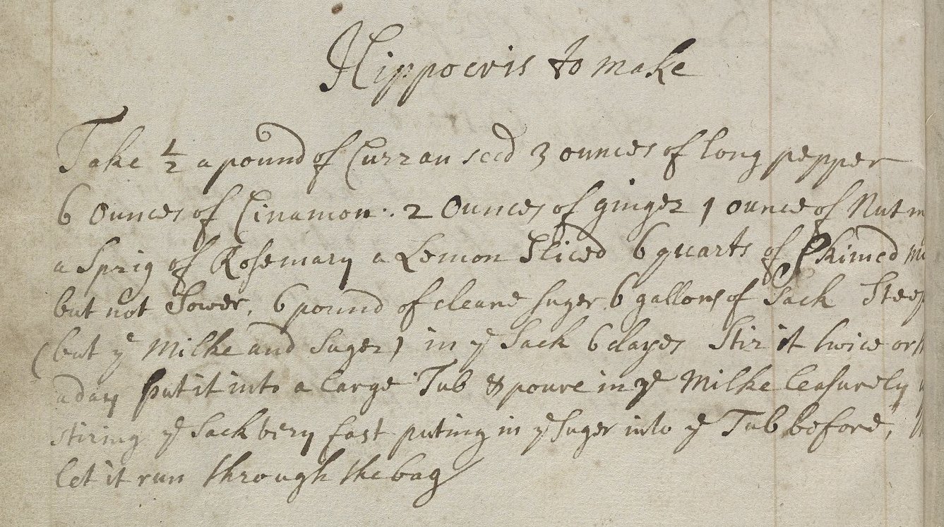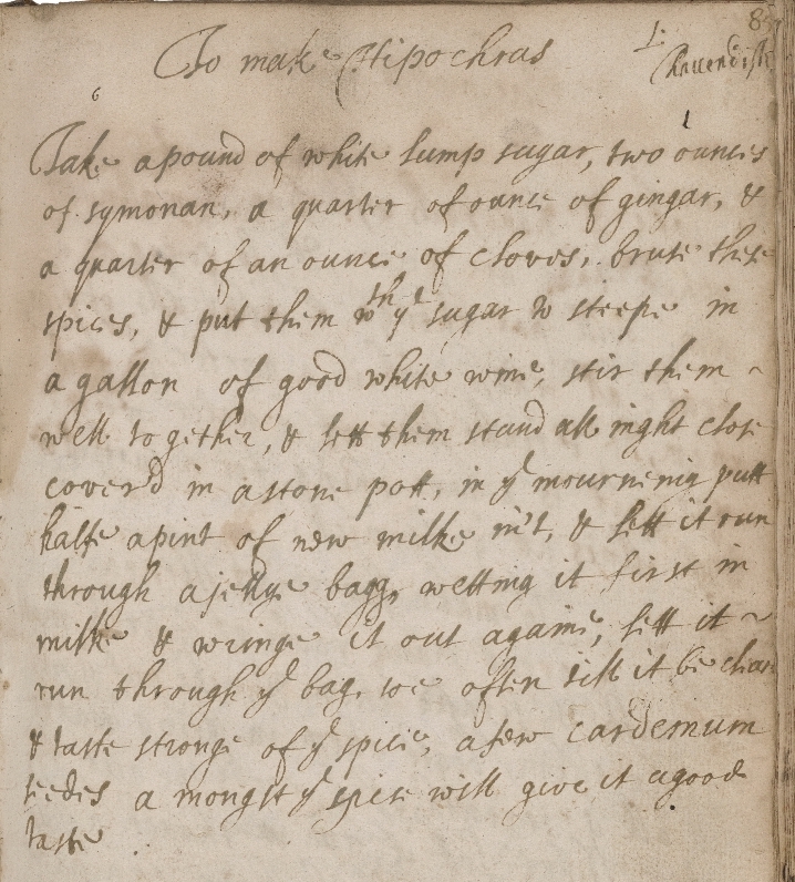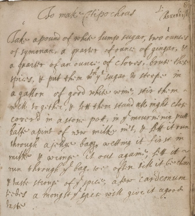 Lady Grace Castleton’s recipe book Folger Ms. V.a.600 includes a receipt “To make Hipochras” from a “Lady Cauendishe.” This version includes cardamon and, like the previous examples, starts with white wine and is strained with milk.