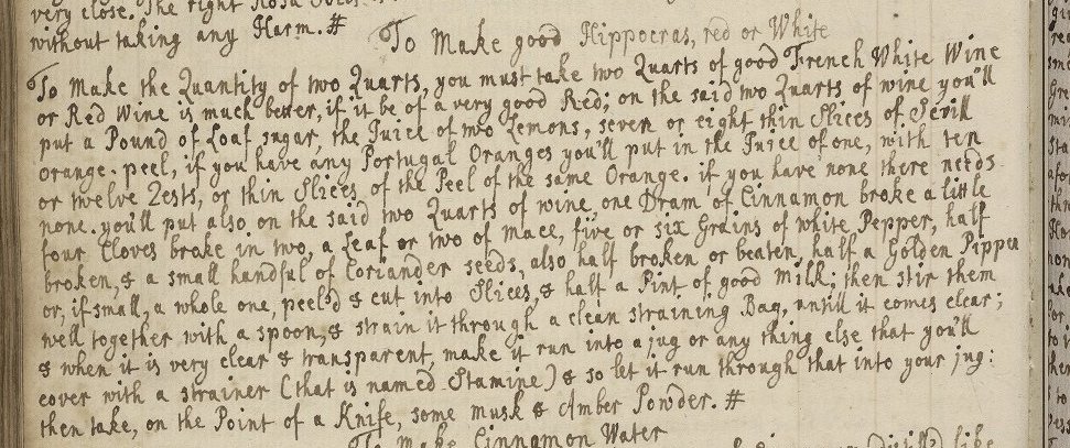 This white wine and sack Hypocrass is from Elisabeth Hawar’s recipe book now held at the Clark Library in fMS.1975.003. It is likely that Elisabeth, or another owner, lived in East London as the book includes manuscript directions to places in Shoreditch and Spitalfields.